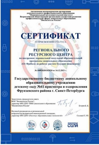 Детский сад с 2021 года являлся региональным ресурсным центром по внедрению парциальной модульной образовательной программе дошкольного образования "От Фребеля до робота: растим будущих инженеров".